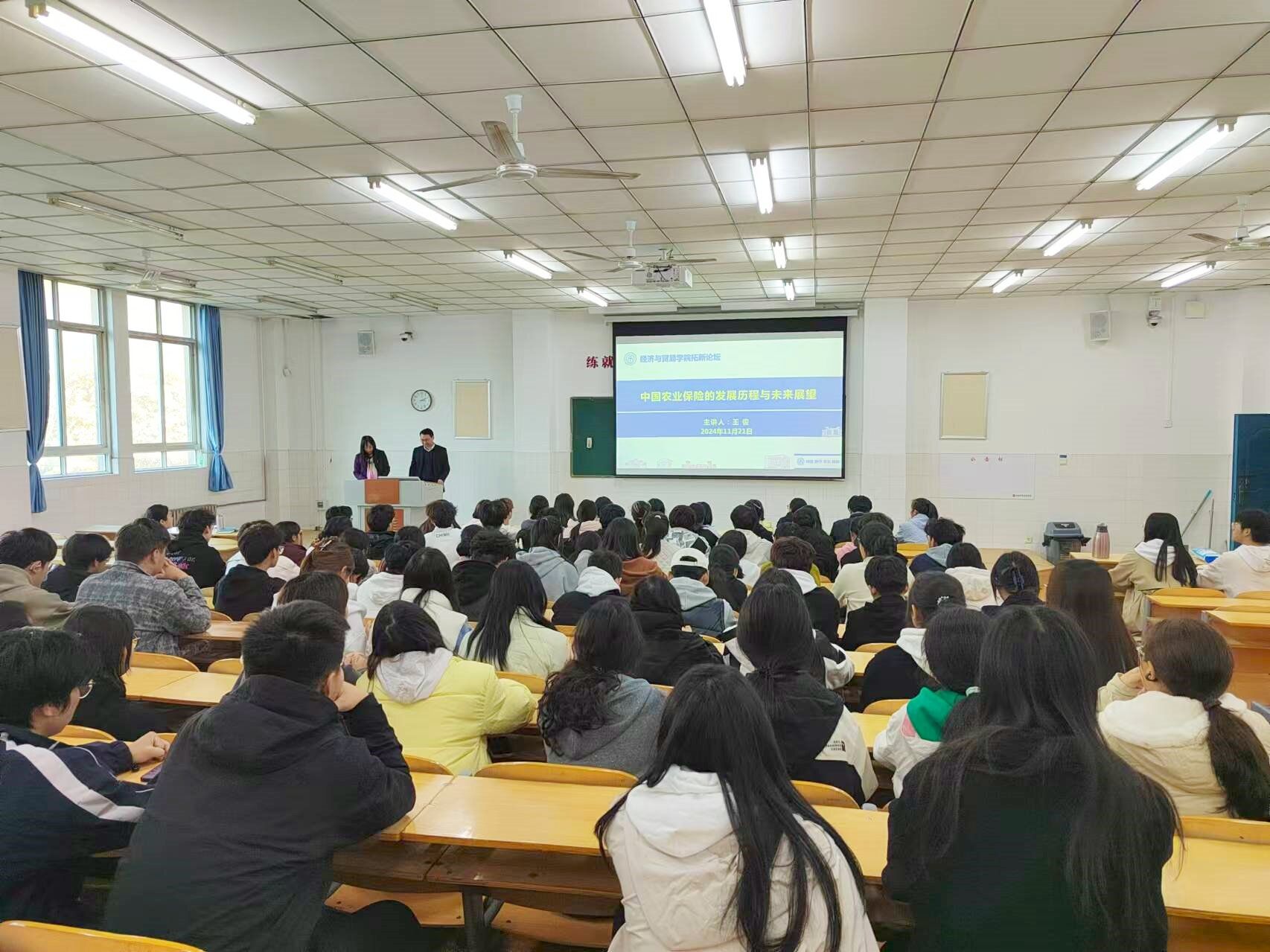 11月21日下午,成人在线免费观看特邀中原农业保险股份有限公司农业保险研究院/乡村振兴部副院长、总经理王俊在英才校区E210为师生作了“中国农业保险的发展历程与未来展望”的专题讲座。讲座由我院副院长杜玲主持,我院22级、23级农林经济管理和商务经济学两个专业200余名学生和部分教师聆听了讲座。