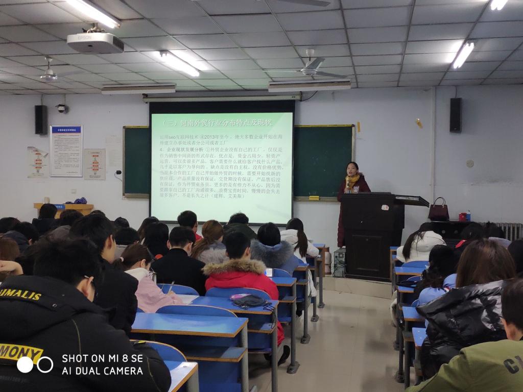 2018年12月6日下午,经济贸易学院在E202教室举办题为《河南外贸企业现状及人才需求特点》的专题讲座。讲座由河南东盈机械设备有限公司人事部经理汪素娟主讲,经贸学院16级经贸01班与经贸02班全体学生参加了此次讲座。
