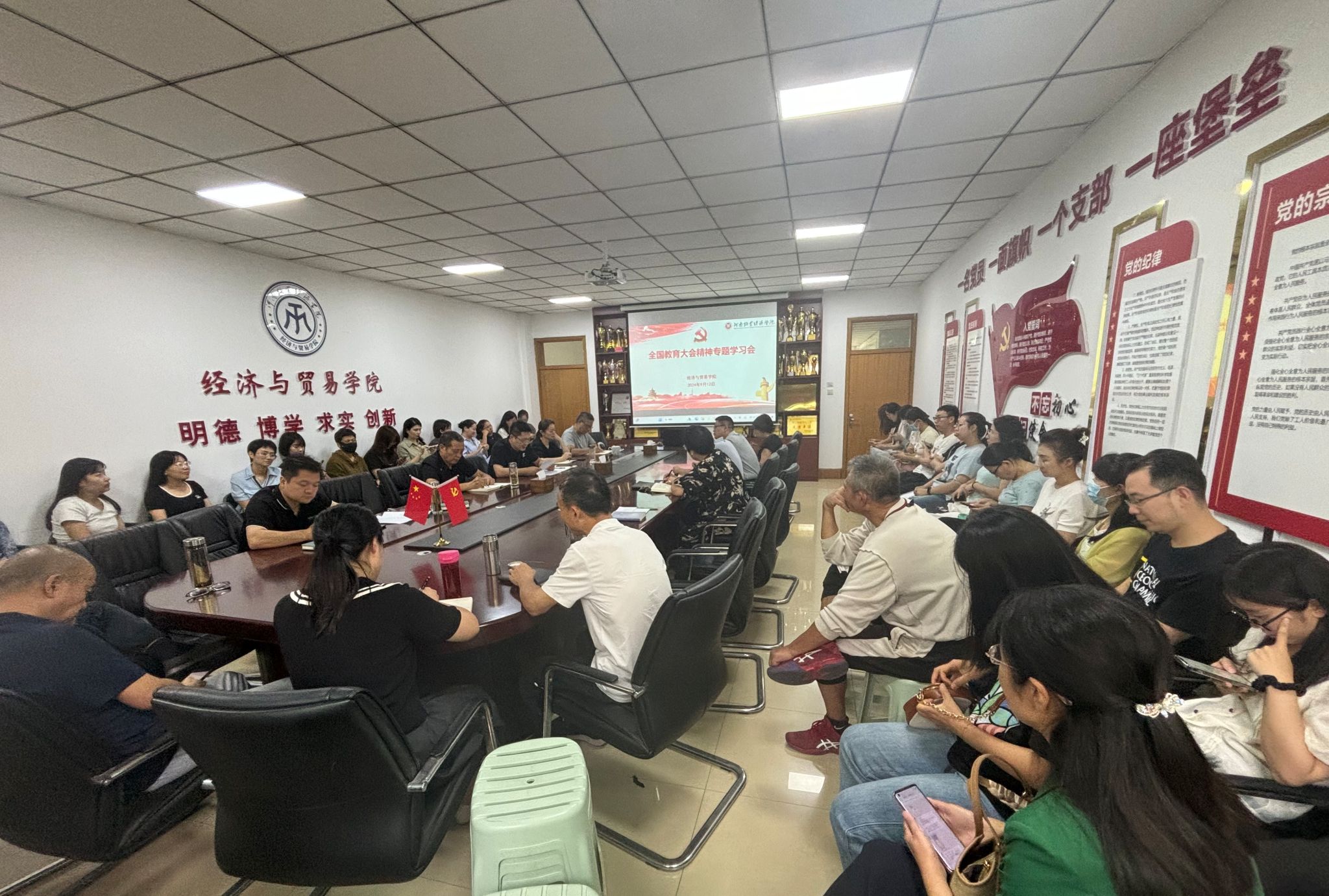 9月12日下午,我院在英才校区教学楼327会议室召开全国教育大会精神专题学习会,集体学习了习近平总书记在大会上的讲话精神,全体教职工参会。会议由院党委书记张松刚主持。