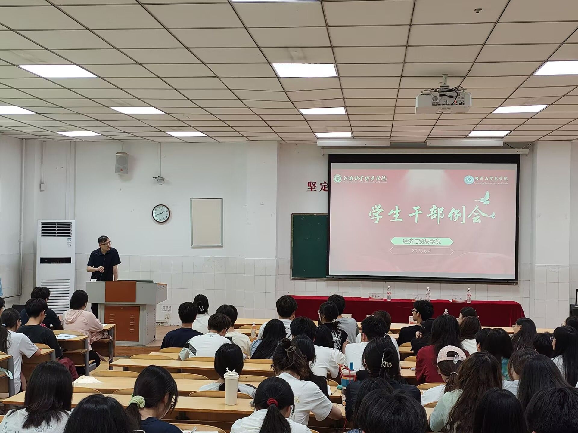 6月4日中午,成人在线免费观看于W209教室召开学生干部例会暨“文明考风,诚信考试”考风考纪动员大会。院党委书记张松刚、党委副书记贾艳艳,副院长孙晓林,院团委副书记李政,全体辅导员老师及全体学生干部共同参会。会议由李政老师主持。