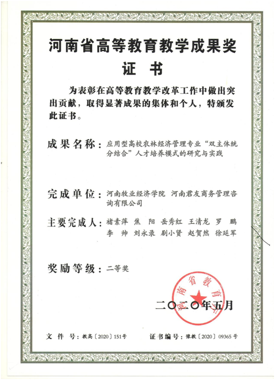 农林经济管理专业是河南省一流本科专业。该专业教研室为河南省优秀基层教学组织,现有专任教师16人,其中博士7人、省级学术带头人2人、省级骨干教师1人、省级优秀教师2人。建有校内实验室6个、省级校外实践基地1个。